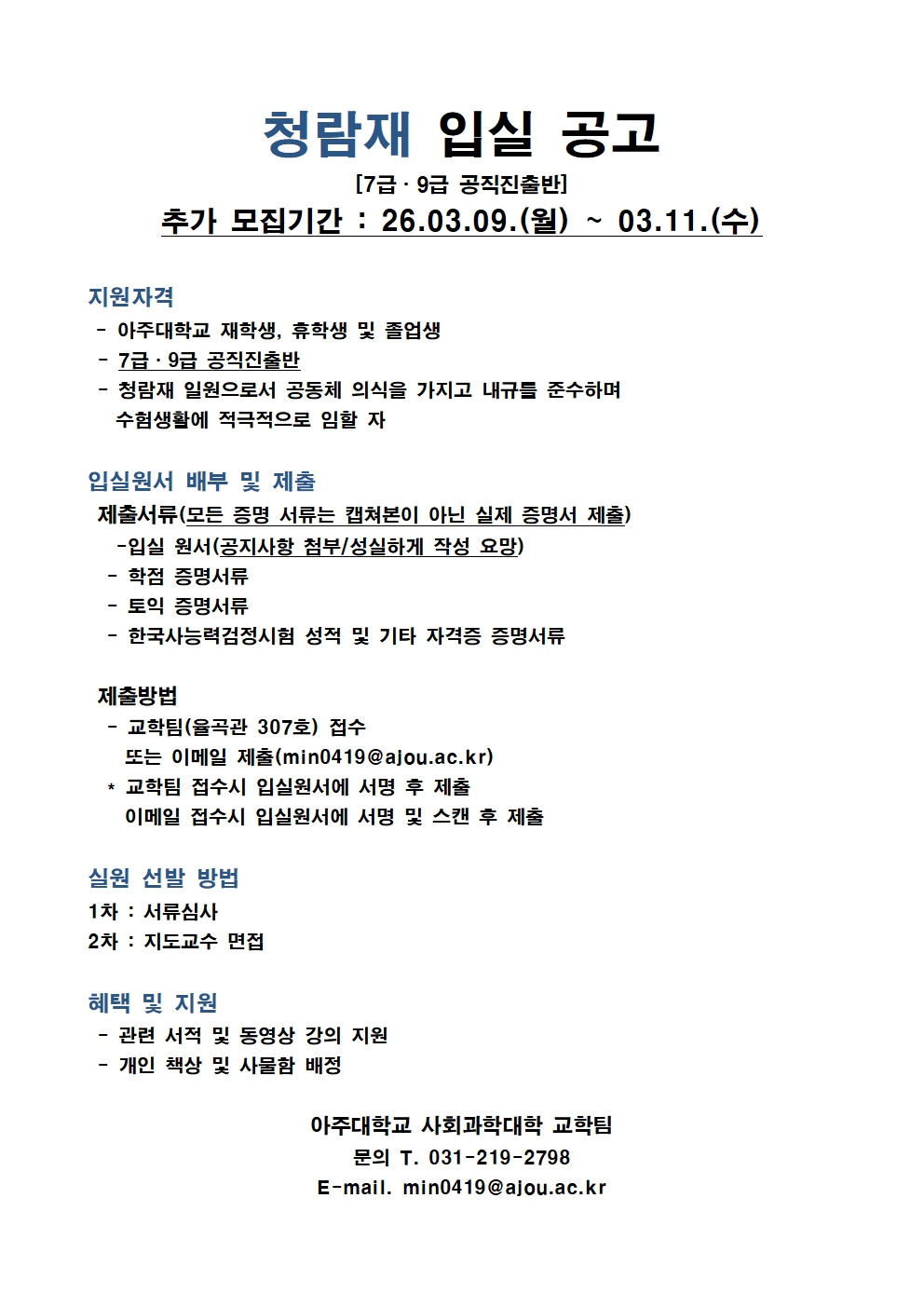 [기타] 2026학년도 1학기 고시반(청람재) 입실 추가 모집 안내(~3/11(수))