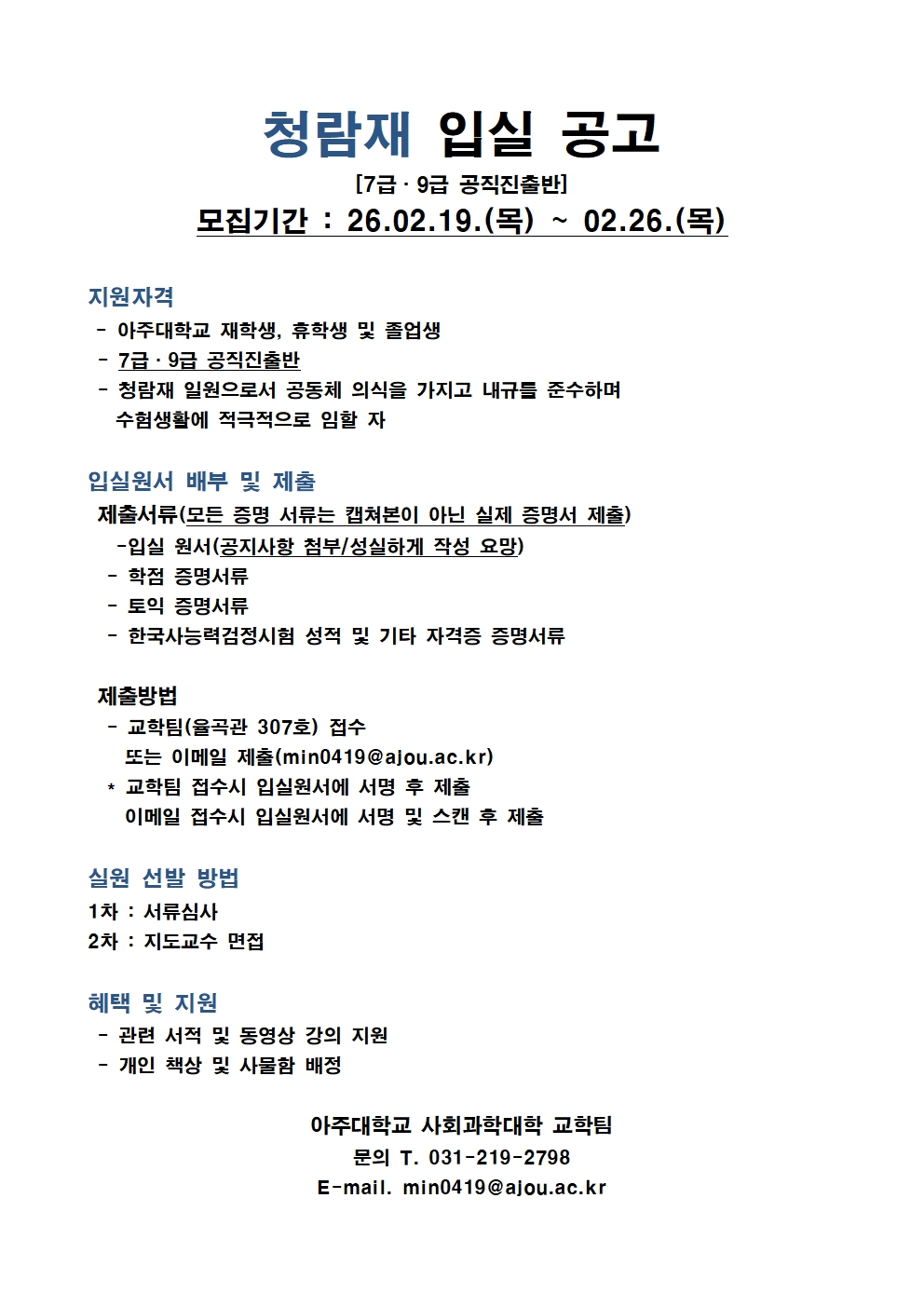 [기타] 2026학년도 1학기 고시반(청람재) 입실 모집 안내(~2/26(목))