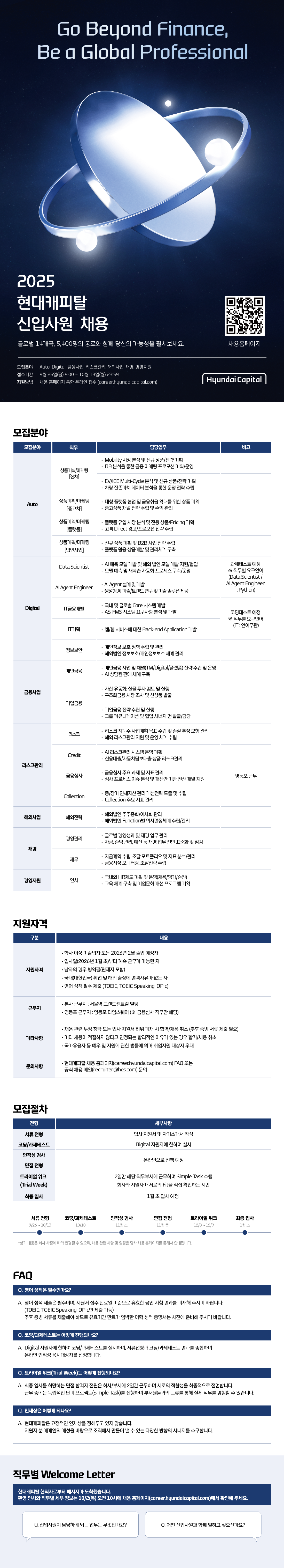 금융으로 모빌리티를 선도하는 현대캐피탈에서 글로벌 리더로 성장할 인재들의 많은 관심과 지원 부탁드립니다.