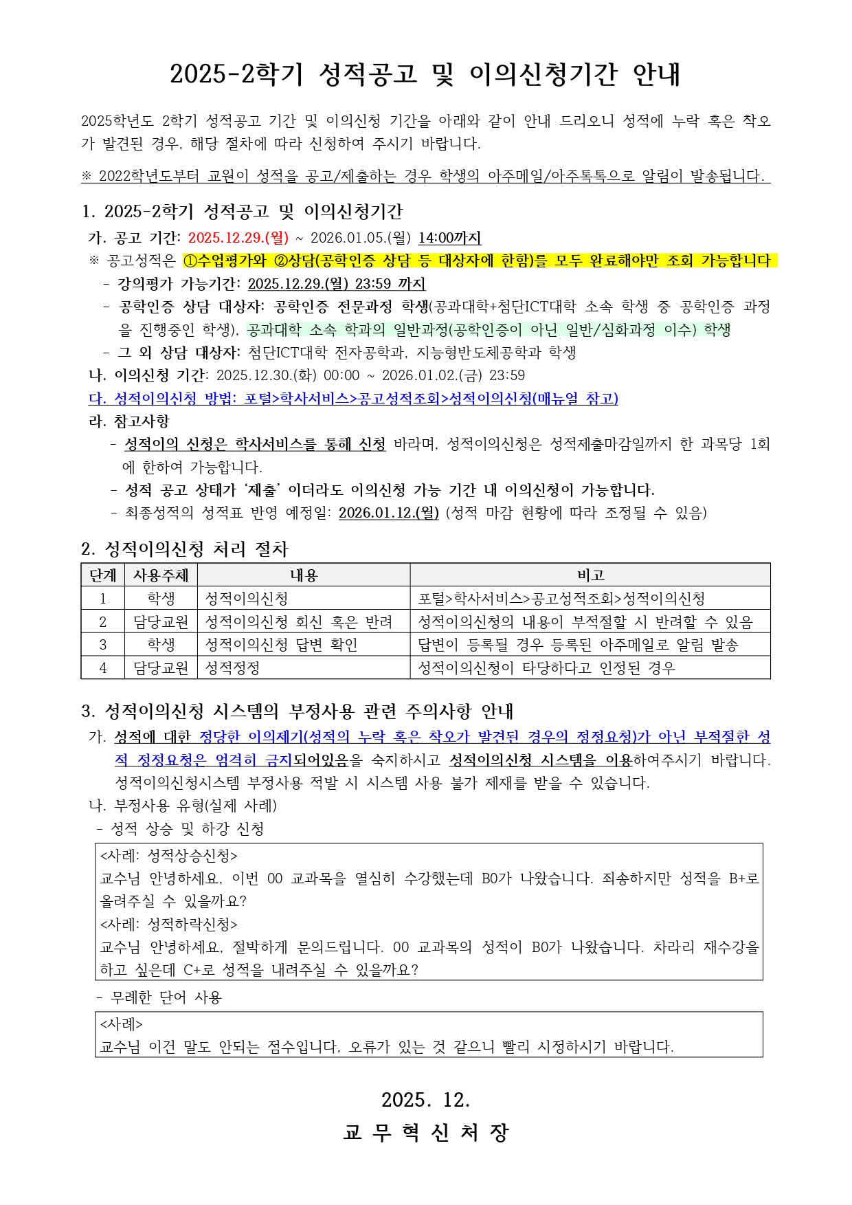 [학사] [안내] 2025-2학기 성적공고 및 이의신청기간 안내 (~01.05 14:00)
