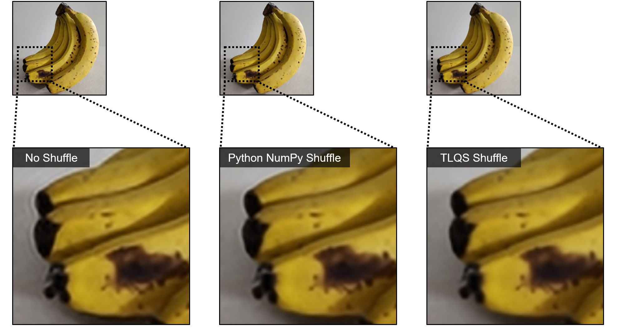 The leftmost image shows the result without using any random number data, the center image uses pseudo-random numbers generated by Python’s NumPy library, and the rightmost image uses random numbers generated by the newly developed TLQS system.