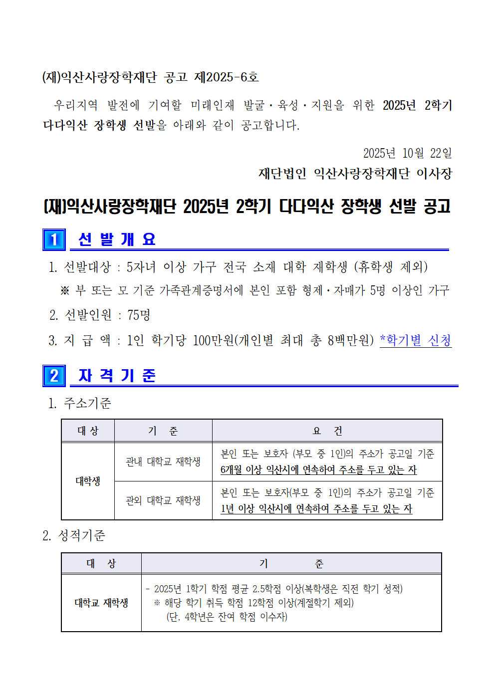 [장학] [교외장학] 2025학년도 2학기 다다익산 장학생 선발 공고